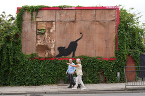 От понеделник шаблонни силуетни изображения на коза, слонове, маймуни, вълк, пеликани и котка се появиха на различни места в Лондон.