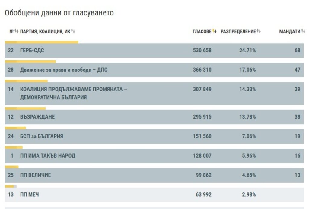 Според настоящите неокончателни данни, всички формации, влизащи в 51-вото Народно събрание, с изключение на партия "Величие", са получили повече гласове на парламентарните избори на 27-и октомври спрямо гласовете за тях на изборите за 50-тото НС, проведени на 9-и юни 2024 г.