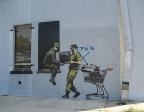 Базираният в Бристол уличен художник сподели снимка на поредната си творба в Instagram, което е обичайният му метод да потвърди, че тя е автентична. Художникът е написал под снимката: "Кралски съдилища. Лондон". Шаблонните графити на Банкси често критикуват правителствената политика, войната и капитализма.