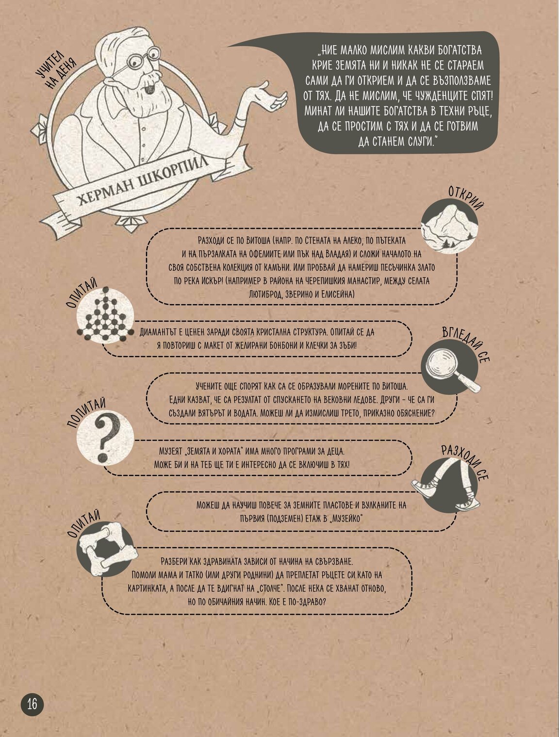 Книгата отправя и предизвикателства към своите читатели, за да експериментират смело и правят нови неща, с които не са се захващали до този момент. Така например, може да опитате да проследите родословното си дърво; да направите колекция от камъни, намерени в планините; да създадете собствен ритон в домашни условия и още много интересни занимания.