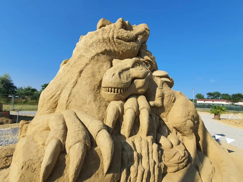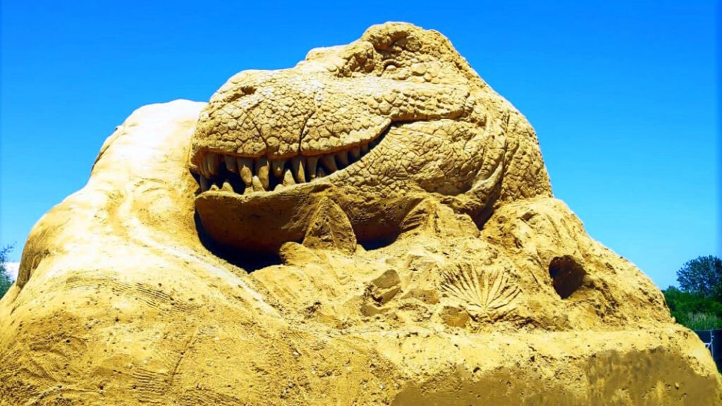 Сред 12-те фигури от пясък ще можете да разгледате динозаври, мамут, гигантска костенурка и други интересни животни. Разбира се, почетно място е отредено на любимия на много деца, Тиранозавър Рекс.
