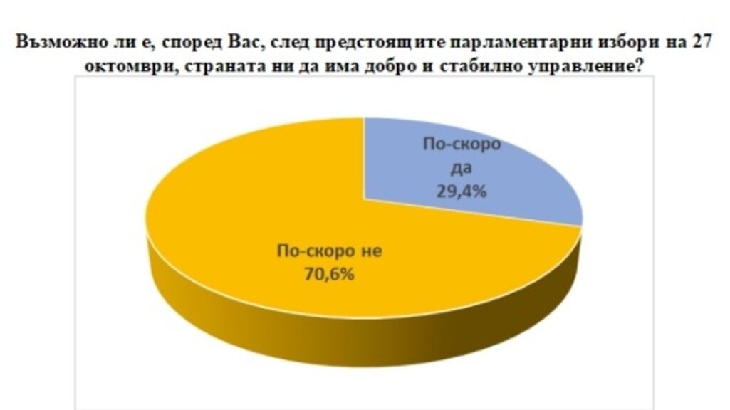 71% от българите, участвали в проучване на "Екзакта", не вярват, че е възможно след изборите на 27 октомври страната ни да има добро и стабилно управление. 29% от интервюираните са оптимисти. По-често допускат, че е възможно добро управление избирателите на ГЕРБ-СДС и на ПП-ДБ. Подобен отговор изразява очаквания техните партии да участват в управлението на страната.