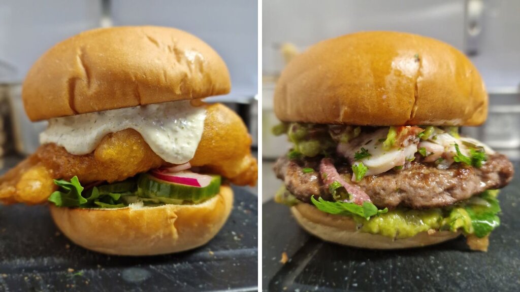 Рибен бургер - планирано филе от треска, тартар сос, "бърза" туршия от червен лук и краставици, и телешки бургер с октопод